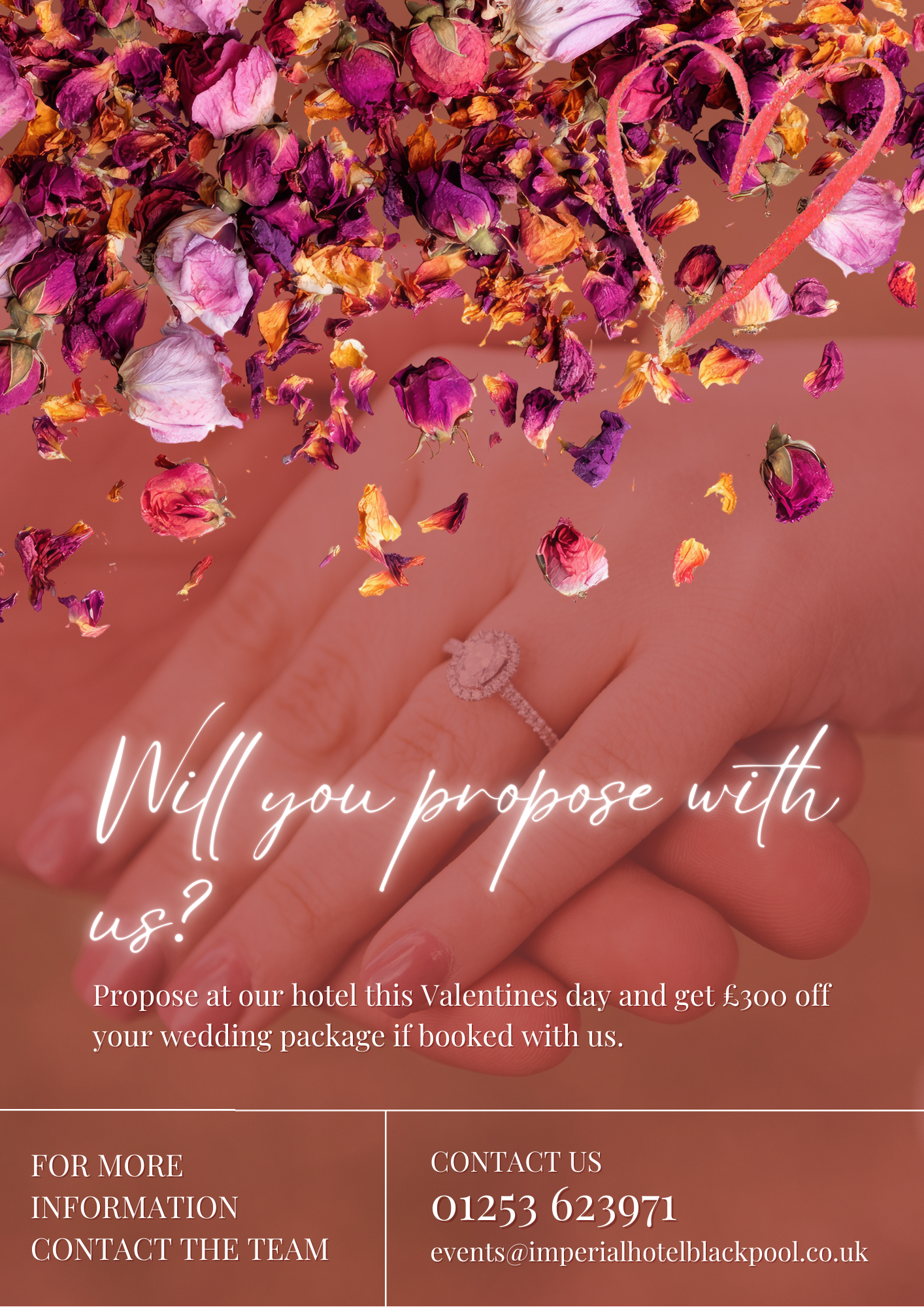 Propose at our hotel this Valentine's Day and get £300 off your wedding package if booked with us. For more information, contact the team. You can call us at 01253 623971, or email events@imperialhotelblackpool.co.uk